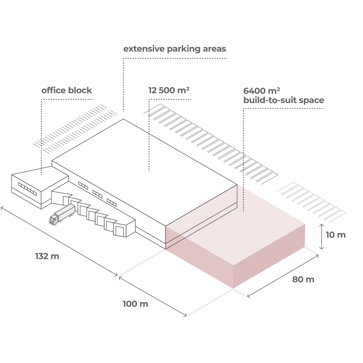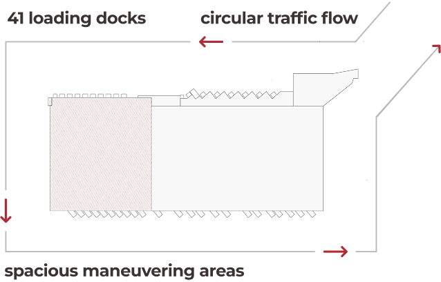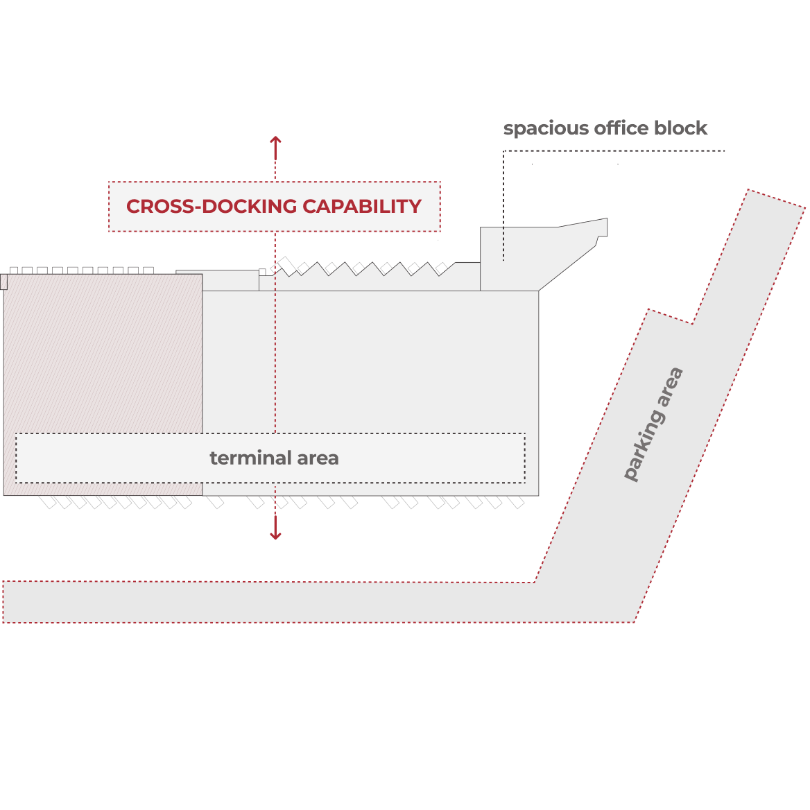 PV3 Business Centre brings together every aspect of your operations in a single, well-planned location. In addition to extensive warehouse and production areas, the property offers modern administrative and office space within a dedicated office block. Ample parking is provided around the building, with areas designed for both trailers and private vehicles. The site layout supports smooth and efficient movement of goods, with direct flow between cross-dock terminals and warehouse areas.